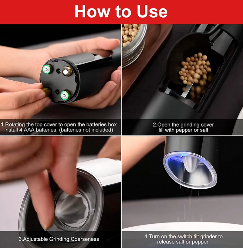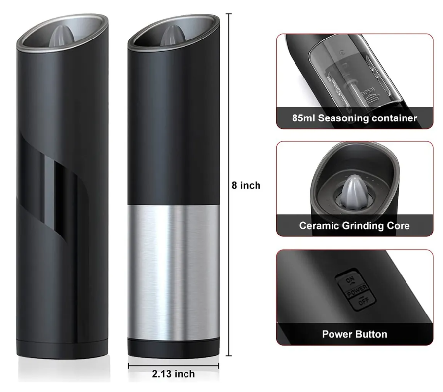 Ampliamente utilizado: este molinillo de sal y pimienta es adecuado para varias especias como pimienta negra, pimienta blanca, clavo, sal cruda, pimienta seca y comino. También es ampliamente utilizado en tu hogar, cocina, al aire libre, camping, fiesta. Disfruta de tu deliciosa comida con el molinillo eléctrico de sal y pimienta.