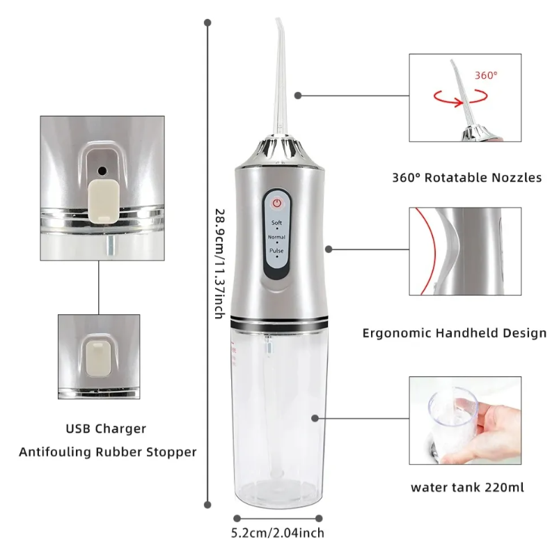 3. El palillo de dientes con chorro de agua es impermeable IPX7 de cuerpo completo y está diseñado con un tanque de agua de 220ml de capacidad, que tiene una buena vida útil y es conveniente para uso diario sin necesidad de un segundo relleno;