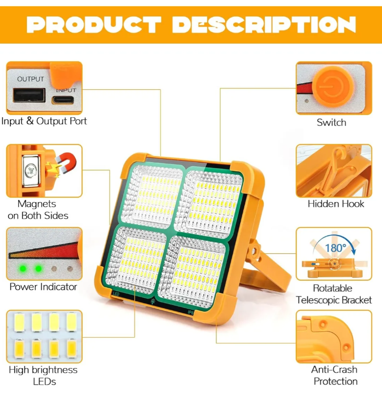 Imprescindible para el hogar y al aire libre: luz de trabajo recargable para almacenes, garajes, senderismo, camping, pesca, emergencia. La luz de inundación solar LED viene con una garantía de 6 meses , si tienes alguna pregunta sobre el producto, no dudes en ponerte en contacto con nosotros.