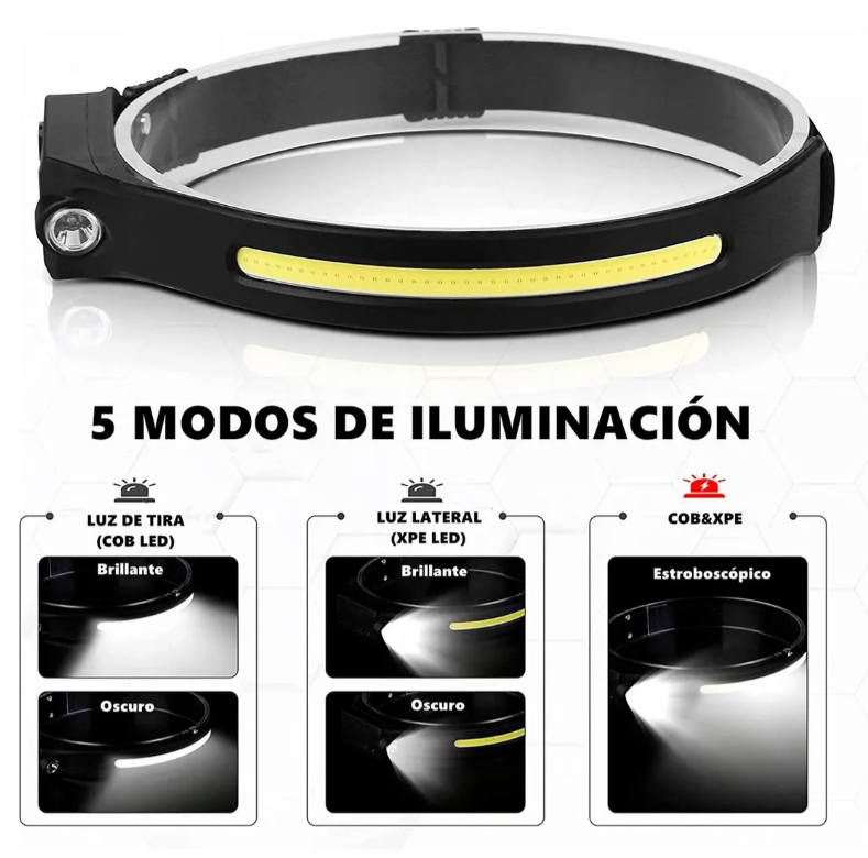 5 modos de iluminación Este faro 5 modos de luz: modo cob alto, modo cob bajo, modo LED alto, modo LED bajo y modo estroboscópico. En cualquier otro modo, mantenga presionado el botón de encendido / apagado para cambiar el modo estroboscópico, y las luces LED y cob parpadearán al mismo tiempo