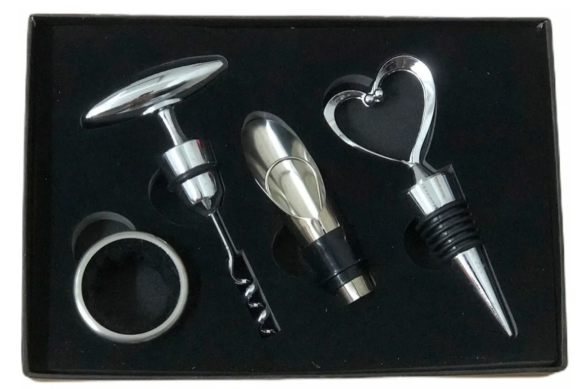 - Sacacorchos - Pico con tapa de silicona - Tapon - Aro salvagotas - Caja carton negro - Ideal Dia del Padre