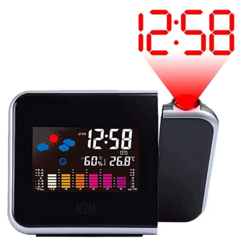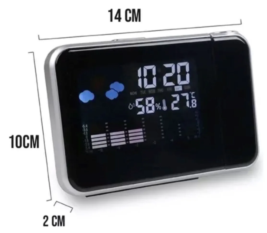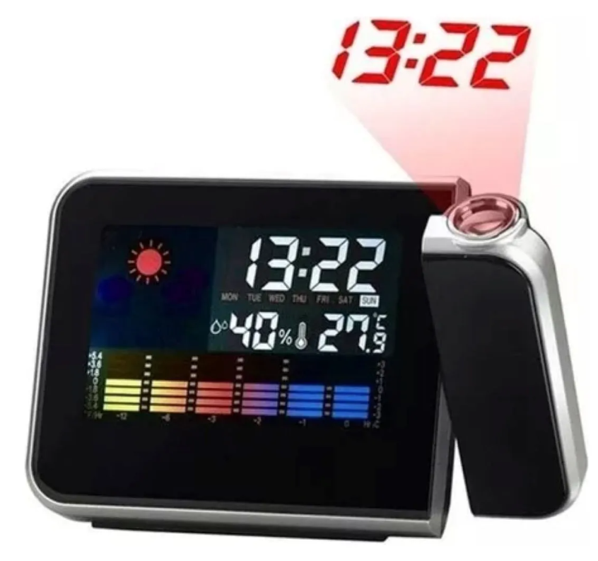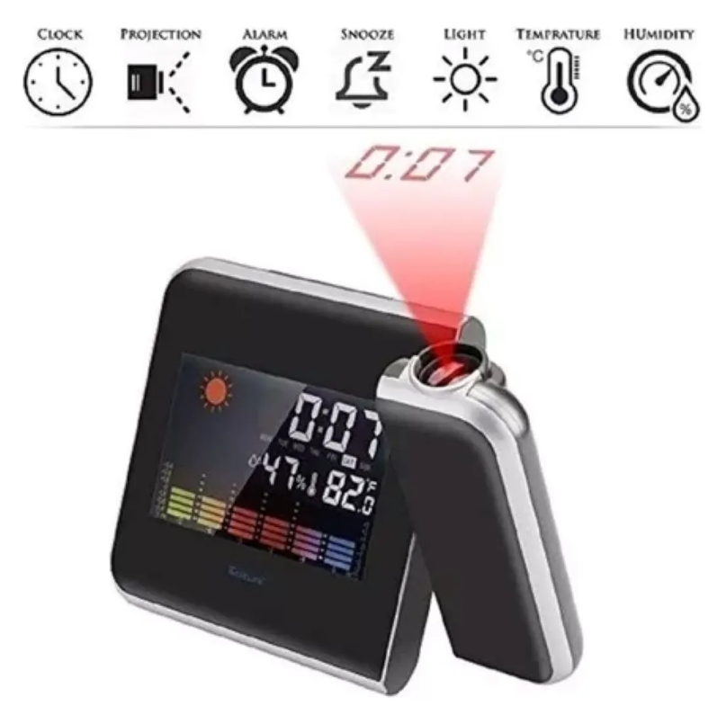 - Obtén toda la información que necesites para pasar el día en cuanto te despiertes. Este reloj tiene una pantalla a todo color que muestra el tiempo, la temperatura, la humedad y proyecta la hora en cualquier pared o techo. También tiene una función de alarma para que nunca te pierdas un ritmo. Funciona con 2 pilas AAA (no incluidas).
