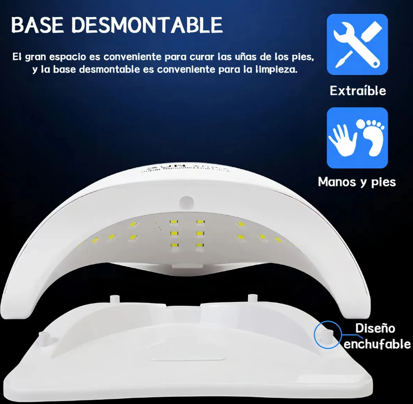 * Base bastante grande y extraíble que hace que la lámpara de uñas UV se ajuste a ambas manos al mismo tiempo o se puede utilizar fácilmente en la uña de los pies.