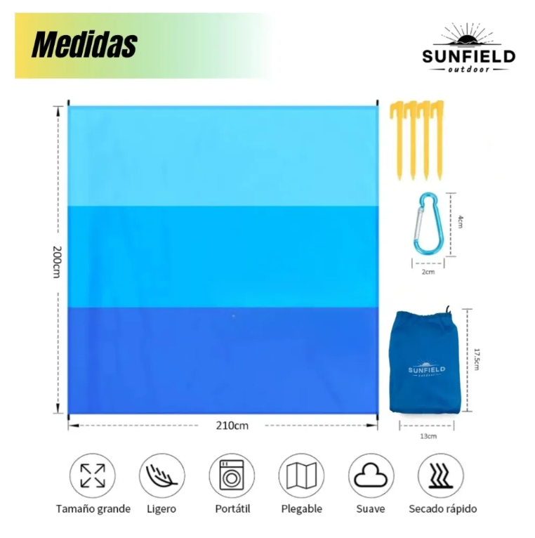 Estacas de Fijación: Cuatro (4) estacas amarillas para anclar la manta al suelo, evitando que el viento la mueva en la playa o el parque.