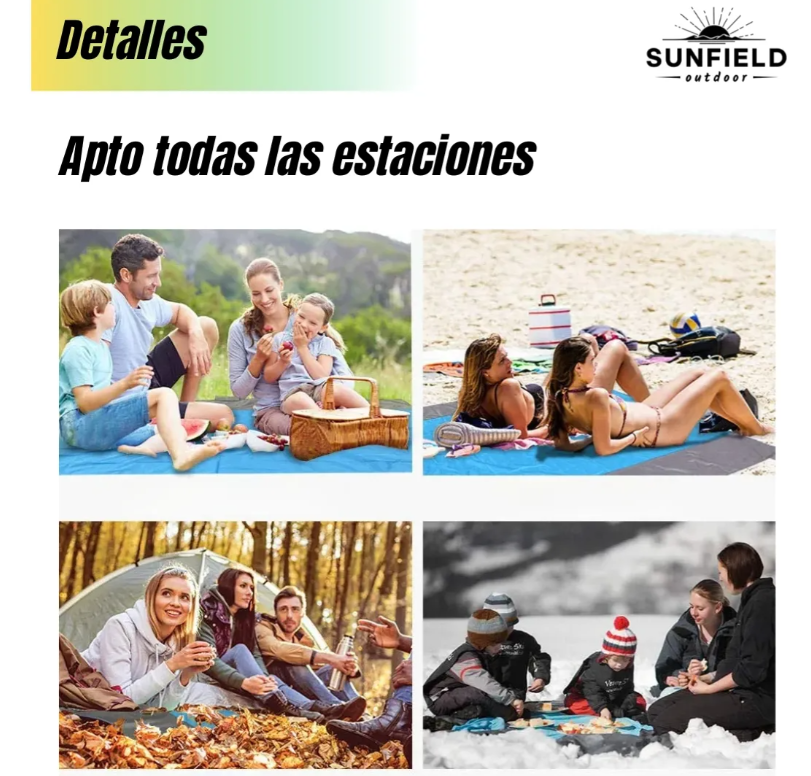 Además, ha sido diseñada para ser apta para todas las estaciones, lo que significa que puedes usarla para tomar el sol en verano, hacer pícnics en primavera, acampar en otoño o incluso como base protectora en invierno.